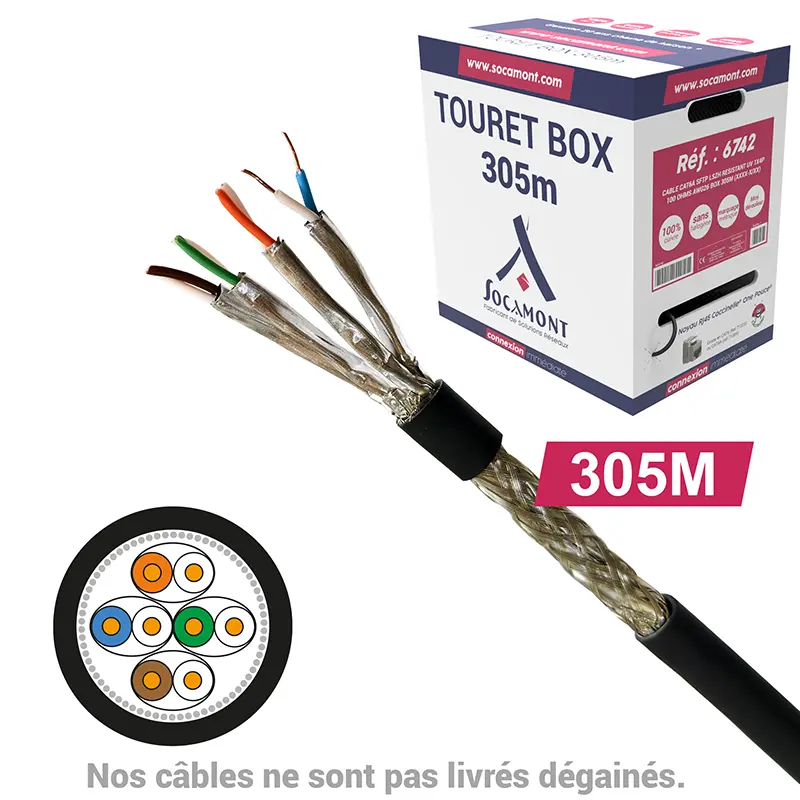 Ce câble réseau Cat6A SFTP est parfait pour les installations exigeantes nécessitant une excellente protection contre les interférences. Sa gaine LSZH résistante aux UV en fait un choix idéal aussi bien en intérieur qu’en extérieur.