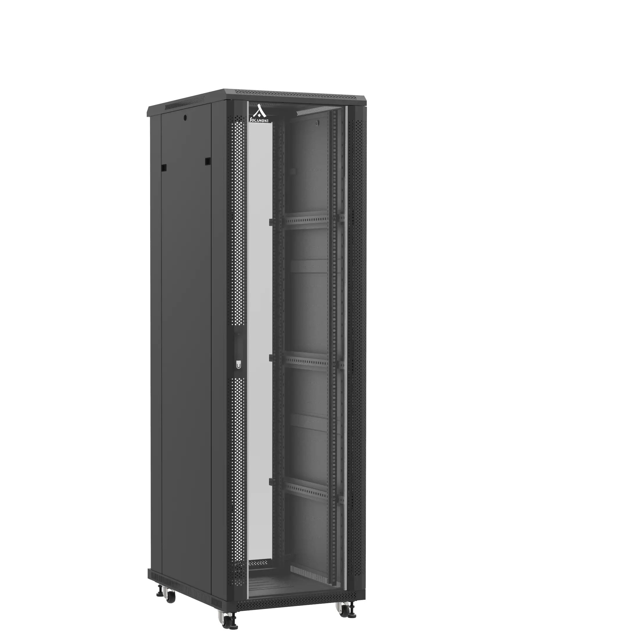Découvrez notre baie 19'' Socamont® en kit ligne 800 de capacité 42U et de dimensions, LxPxH (mm) : 600x800x2060. Toutes nos baies Socamont® sont assemblées en France dans nos ateliers ! Elles existent dans toutes les tailles et sont très performantes. Les panneaux de nos baies sont amovibles & démontables sans outils. La porte est également démontable sans outils. Les montants de nos baies Socamont® sont ajustables & sérigraphiés. Cette armoire informatique 19 pouces dispose en série de 4 pieds réglables en hauteur et de 4 roulettes.
