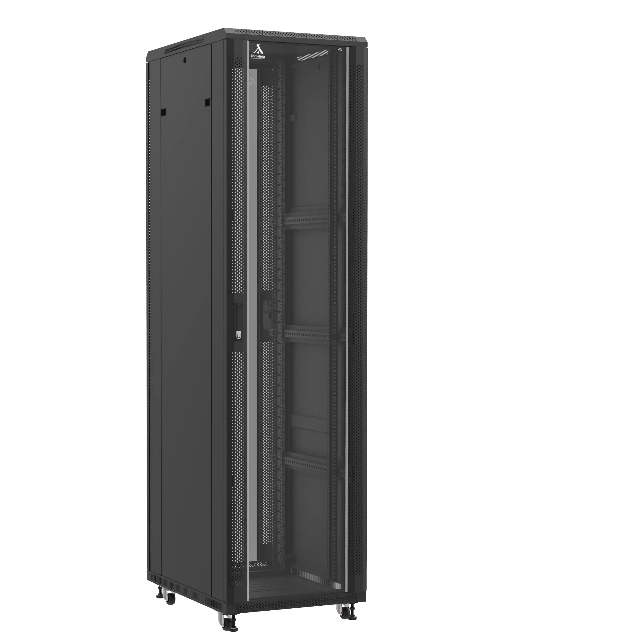 Découvrez notre baie 19'' Socamont® montée ligne 800 de capacité 47U et de dimensions, LxPxH (mm) : 600x800x2277. Toutes nos baies Socamont® sont assemblées en France dans nos ateliers ! Elles existent dans toutes les tailles et sont très performantes. Les panneaux de nos baies sont amovibles & démontables sans outils. La porte est également démontable sans outils. Les montants de nos baies Socamont® sont ajustables & sérigraphiés. Cette armoire informatique 19 pouces dispose en série de 4 pieds réglables en hauteur et de 4 roulettes.