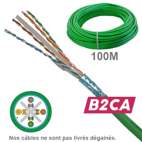 Câble réseau CAT6 FUTP LSZH B2ca 1x4P, livré en couronne de 100m. Conçu pour les applications 10 Gigabit Ethernet, il supporte des fréquences jusqu'à 500 MHz grâce à son blindage général aluminium/polyester (FUTP). Sa gaine sans halogène (LSZH) est classée Euroclasse B2ca : non propagateur de la flamme, non propagateur de l'incendie (≤ 1,50 m avec essai normalisé comportant une source 20,5 kW), faible dégagement de chaleur, faible émission de fumée. Compatible PoE, PoE+ et UPoE.