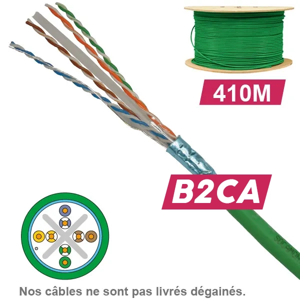Câble réseau CAT6 FUTP LSZH B2ca 1x4P, livré en touret de 410m. Conçu pour les applications 10 Gigabit Ethernet, il supporte des fréquences jusqu'à 500 MHz grâce à son blindage général aluminium/polyester (FUTP). Sa gaine sans halogène (LSZH) est classée Euroclasse B2ca : non propagateur de la flamme, non propagateur de l'incendie (≤ 1,50 m avec essai normalisé comportant une source 20,5 kW), faible dégagement de chaleur, faible émission de fumée. Compatible PoE, PoE+ et UPoE.