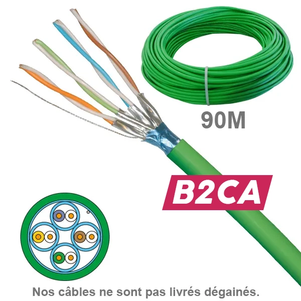 Câble réseau CAT6A FFTP LSZH B2ca 1x4P, livré en couronne de 90m. Conçu pour les applications 10 Gigabit Ethernet, il supporte des fréquences jusqu'à 500 MHz grâce à son blindage général et écrans individuels sur chaque paire (FFTP). Sa gaine sans halogène (LSZH) est classée Euroclasse B2ca : non propagateur de la flamme, non propagateur de l'incendie (≤ 1,50 m avec essai normalisé comportant une source 20,5 kW), faible dégagement de chaleur, faible émission de fumée. Compatible PoE, PoE+ et UPoE.