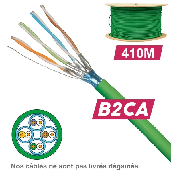 Câble réseau CAT6 FUTP LSZH B2ca 1x4P, livré en touret de 410m. Conçu pour les applications 10 Gigabit Ethernet, il supporte des fréquences jusqu'à 500 MHz grâce à son blindage général aluminium/polyester (FUTP). Sa gaine sans halogène (LSZH) est classée Euroclasse B2ca : non propagateur de la flamme, non propagateur de l'incendie (≤ 1,50 m avec essai normalisé comportant une source 20,5 kW), faible dégagement de chaleur, faible émission de fumée. Compatible PoE, PoE+ et UPoE.