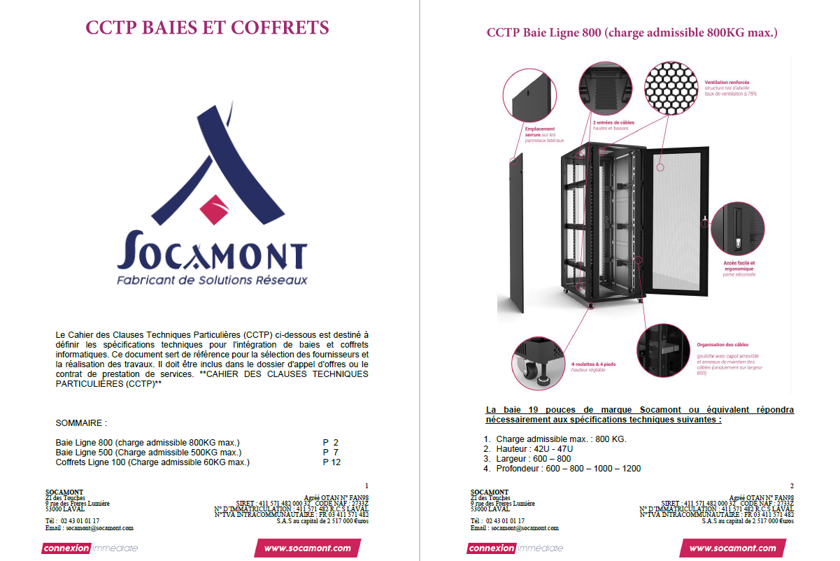 Le Cahier des Clauses Techniques Particulières (CCTP) qui vous sera envoyé par nos équipes est destiné à définir les spécifications techniques pour l'intégration de baies et coffrets informatiques. Ce document sert de référence pour la sélection des fournisseurs et la réalisation des travaux. Il doit être inclus dans le dossier d'appel d'offres ou le contrat de prestation de services.