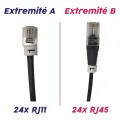 Ces cordons permettent de connecter la gateway Mitel EX/GX vers le réseau informatique banalisé en RJ45. Le cordon est équipé de 24 RJ11 à une extrémité, l'autre extrémité est équipée de 24 RJ45. Ce câble réseau fait une longueur de dix mètres. Retrouvez toute notre expertise en câblages cuivres parmis nos services.